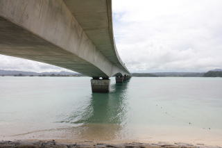 古宇利大橋の下から・・・ 丘の上から見る海は本当に鮮やかな色。 この色をいろんな角度から焼き付けたくて、橋の下に行ってみました。 やっぱり、きれいだ!今回はここを折り返し地点にして、那覇に戻る。 |