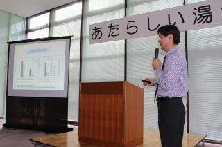 | 大塚教授の講演。 北海道大学で自然療法を用いた疾患治療法の研究など多数。 川湯温泉がいかに素晴らしい土地、温泉なのかを講演していただいた。 川湯温泉・・・ここに来るだけでも自然療法の観点から意味があると言う。 |