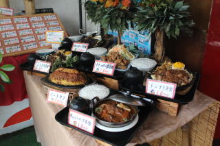 実物のサンプルです。 だましなし!!本物の料理のサンプルが並ぶ。 でも、ちょっと異様な感じがする。。。 |