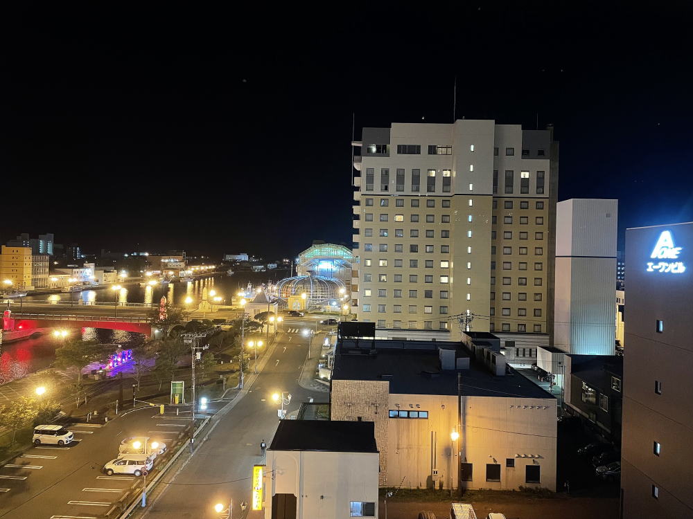 | 夜のとばりが降りた釧路の街。 コロナの折、やっぱりホテルの空室が目立ちますね。 |